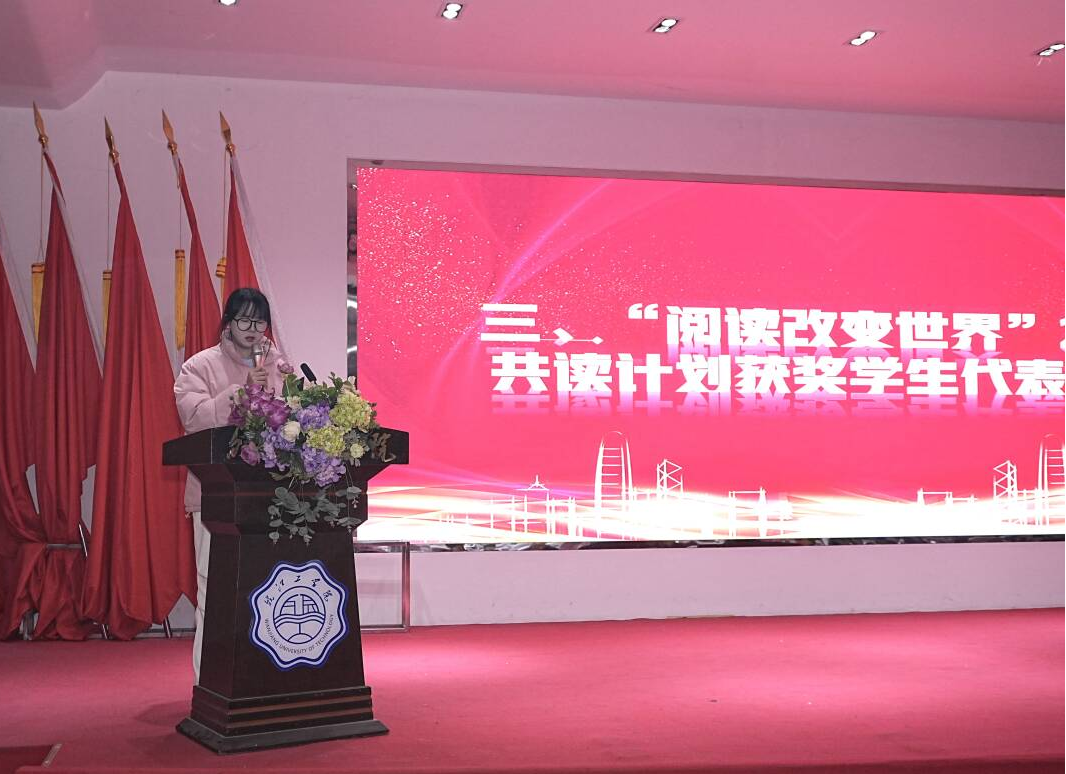 决赛环节结束后,“阅读改变世界21天共读计划”打卡比赛的获奖学生代表袁蔚琬同学上台发言。她分享了自己21天坚持阅读打卡的心路历程,讲述了阅读如何从“任务”转变为“习惯”,又如何为她的专业学习和人生视野带来滋养。她呼吁同学们将阅读融入日常,让书香持续浸润青春,共同绘制更加绚烂的书香校园画卷。