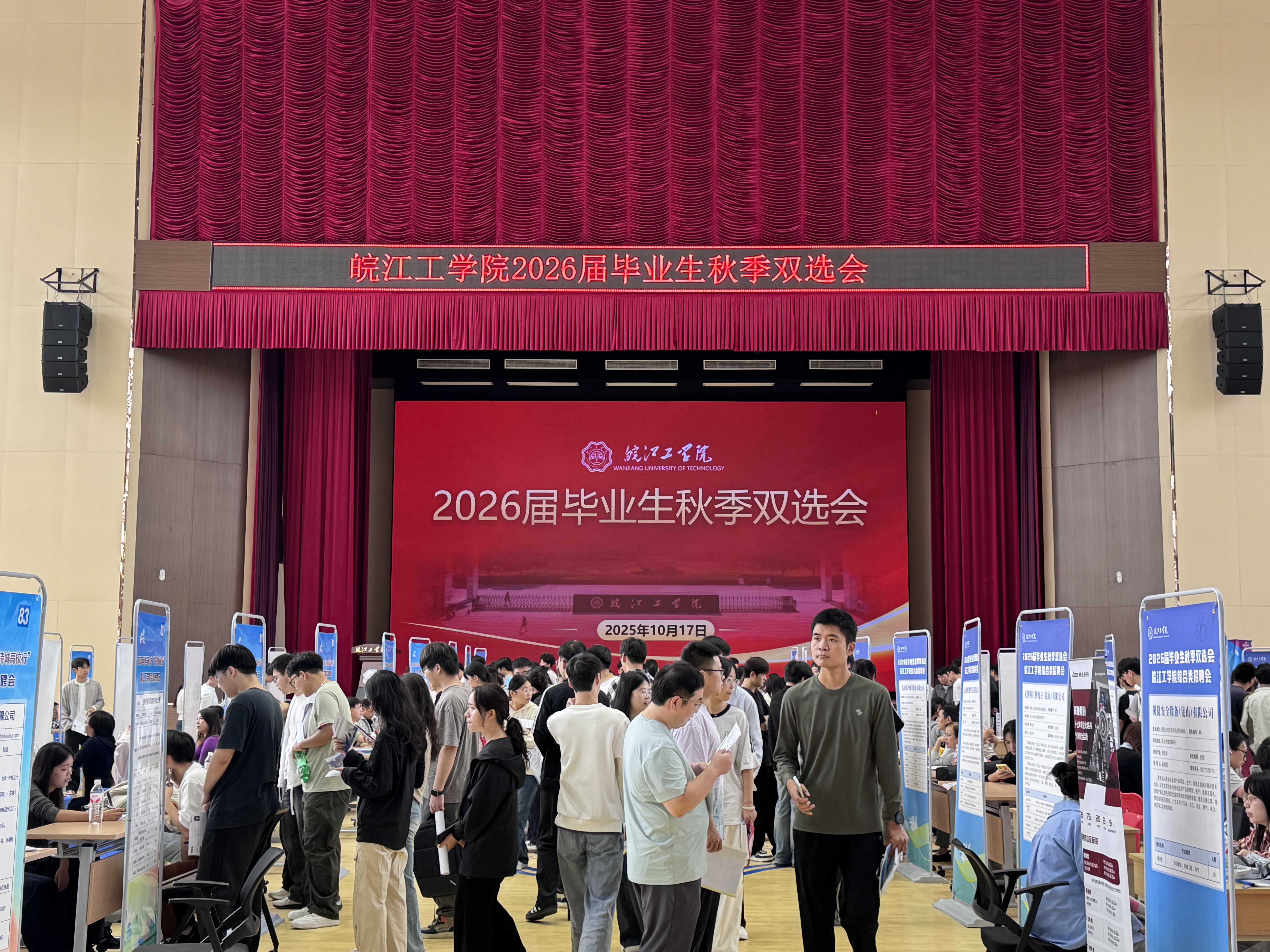 为进一步促进毕业生高质量就业,搭建用人单位与毕业生双向选择的平台,10月17日,皖江工学院 2026 届毕业生秋季双选会在我校体育馆成功举行。此次双选会吸引了众多企业参会,为毕业生提供了丰富的就业机会。学生工作部常务副部长汪朱华深入双选会现场,详细了解招聘会的组织情况,与毕业生、用人单位亲切交流,各学院副书记、就业指导中心相关人员和全体毕业班辅导员参加招聘会现场指导工作。